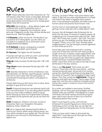 That is, until the event. No one knows why, but the majority of those who had received the ink turned into grotesque monsters and turned immediately on those of us who remained. The more tattoos, the more likely it was that you turned. We've been on the brink ever since.