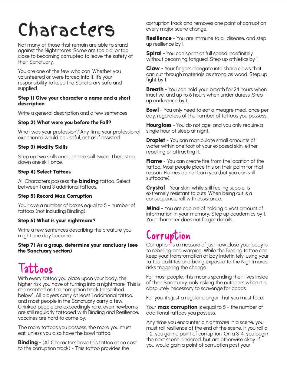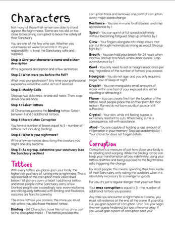 In Enhanced Ink you take on the role of those who protect their Sanctuary: leaving safety to collect supplies and fight back the Nightmares. But even exposure to nightmares can cause anyone with tattoos to turn themselves. Can you carve out some little peace and keep your sanctuary safe? Or will you become the thing that stalks what's left of the world?